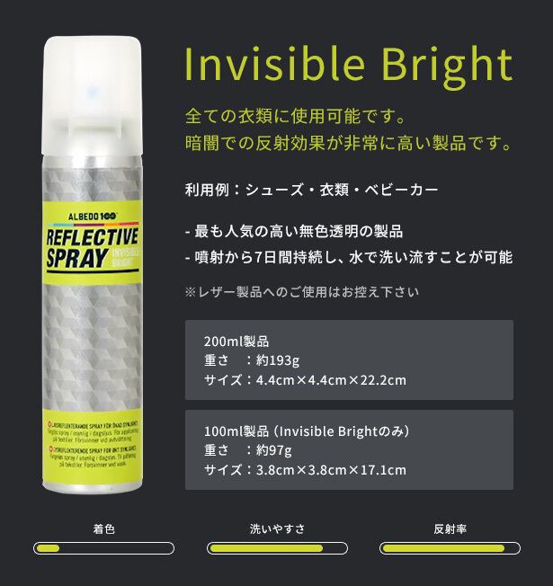 バックパックやシューズ、ランニングウェアやパーカー、コート。さらにはベビーカーにも。短期間の使用であれば自転車本体やヘルメットなどへの使用も可能です。スプレーを行ってもその塗布面は無色透明です。皮革製品をのぞくほぼすべての衣類等に使用ができるバリエーションです。