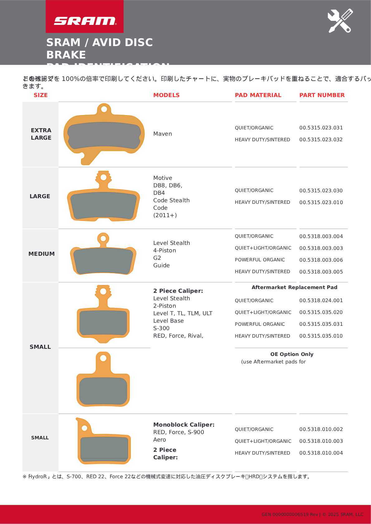 ・Red AXS(~2019年)、Red eTap、S-900HRD、2ピストン式のLevelシリーズに適合。キャリパーがモノブロック構造の1ピース型キャリパー。