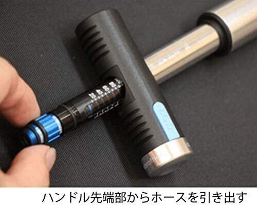 エルゴノミックなハンドルと、マグネットでカチッとくっ付く、本体に収納式のホースを備えるミニポンプ。